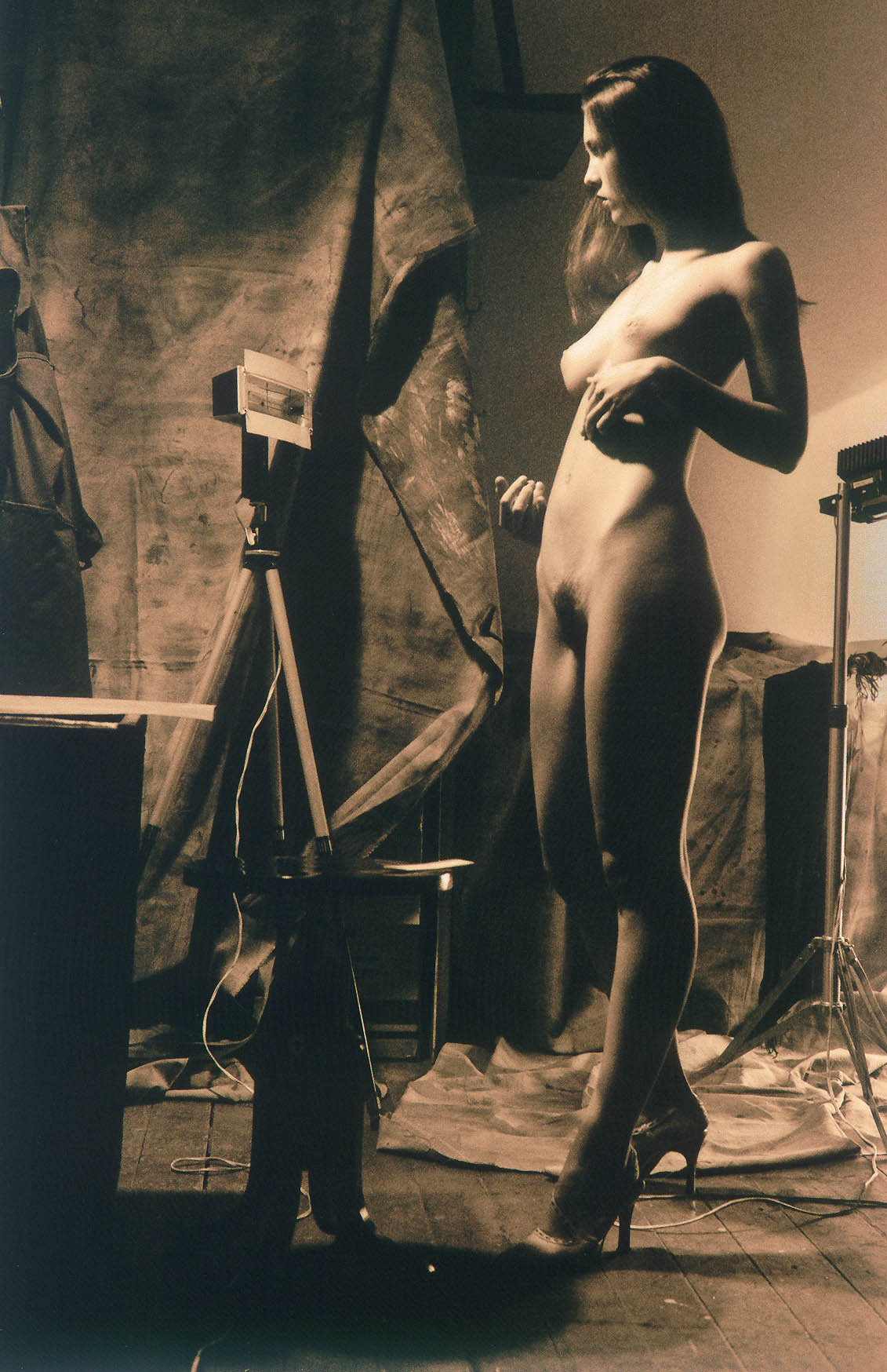 Передо мной висит Ян Саудек. Для меня он был открытием. Привлекла живописность его раскрашенных картинок и мне всегда было интересно наблюдать, как китч можно превратить в искусство. Потом - незатейливость его художественных средств. Он всю жизнь на одной стенке шершавой фотографировал и, в принципе, не выходя из квартиры или студии. Поражен был этим. Потом, мир моды привлекал, Ричард Аведон, который у всех на слуху, Хельмут Ньютон, Говард Шац... Я бы не сказал, что изучал историю фотографии глубоко, чтобы искать себе кумиров. Я ориентировался на изобразительное искусство, понимая, что как только вещь у тебя получается, ты себя ловишь на мысли, что где-то это уже было. Это уже кто-то делал. Смотришь, лежащая, ага - вспоминаешь Рембрандта или Джорджоне, или с жемчужной сережкой... Ты смотришь и понимаешь, что всё уже было. Т.е. живопись и графика много старше фотографии. Поэтому фотография все равно будет где-то на вторых планах в сравнении с этим.